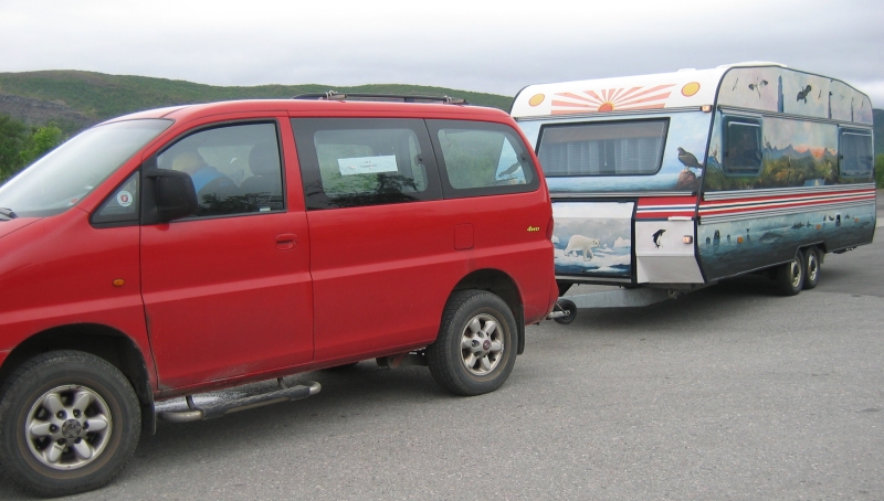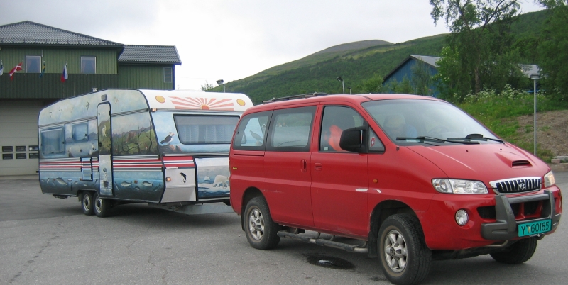 Her er campingvogna og bilen til Olav Johannesen ved Bil og Maskin i Austertana innen avreise. I bakgrunnen Ildtoppen.